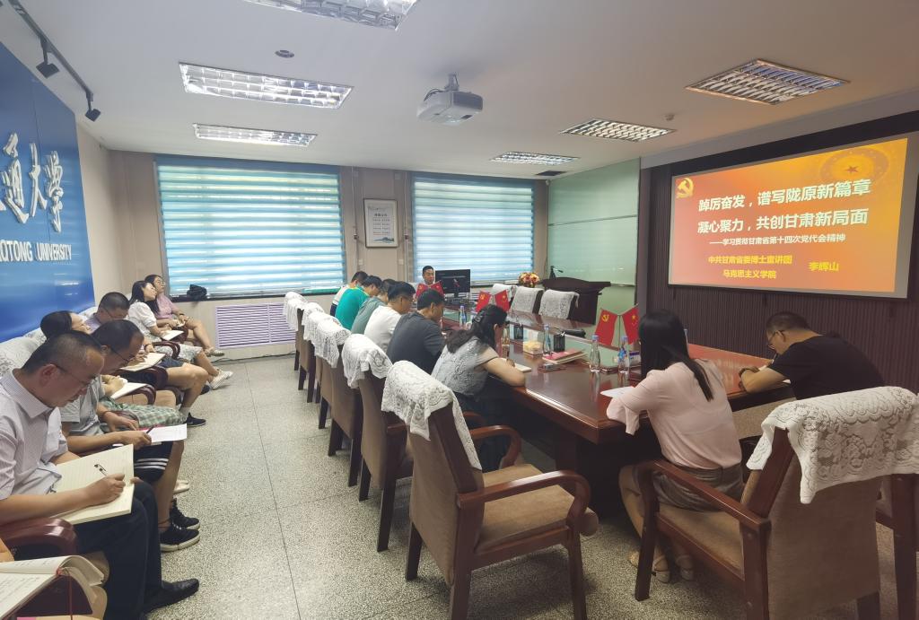 李辉山副教授以“踔厉奋发,谱写陇原新篇章 凝心聚力,共创甘肃新局面——学习贯彻甘肃省第十四次党代会精神”为题,从甘肃省第十四次党代会概况;甘肃省第十四次党代会报告全文解读;学习贯彻好党代会精神,为建设幸福美好新甘肃贡献力量三个方面深入讲解甘肃省第十四次党代会精神,重点讲解尹弘书记代表中国共产党甘肃省第十三届委员会向大会作题为《继往开来奋进伟大新时代 富民兴陇谱写发展新篇章 为全面建设社会主义现代化幸福美好新甘肃努力奋斗》的报告。首先从决战决胜脱贫攻坚、调整助推高质量发展、生态环境质量持续改善、全面深化改革、增进民生福祉、强化意识形态阵地建设、扎实推动民主法制建设、全面加强党的建设八项业绩回顾过去五年甘肃取得的历史性成就和进步,然后准确把握甘肃发展的阶段性特征和存在的问题,提出未来五年甘肃工作的总体要求和奋斗目标,以实施强科技、强工业、强省会、强县域“四强”行动为抓手,以重点地区和关键领域为突破口,构建“一核三带”区域发展格局,最后达到全省综合经济实力实现新跃升、绿色转型发展取得新突破、人民生活水平迈上新台阶、社会文明程度得到新提高、社会治理效能达到新水平、全面从严治党呈现新气象的更高目标。