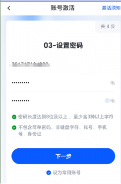 第三步 需要用户设置密码,同时系统将按照内置的密码得分算法对用户密码进行评分,若评分低于规定分值,则不允许用户提交。