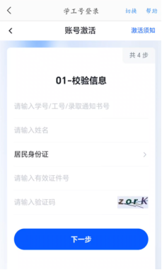 第一步点击“账号激活”,需要用户填写已经提前预置在系统中的学工号、姓名以及身份证号,确认身份的有效性。阅读“激活须知”后,点击“我知道了”