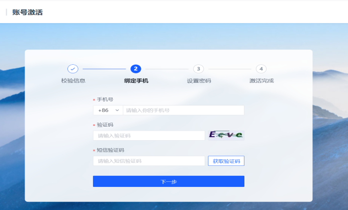 当用户输入手机号后,系统会向用户输入的手机号发送确认短信。用户输入所获取的验证码后,点击下一步,方可继续激活流程。