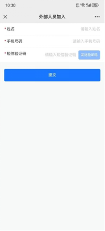 登录地址,输入姓名及手机号,会固定加入学校的外部人员组织(通过企微进行权限控制,防止学校敏感信息外泄)。应用的权限由应用本身进行控制。通过当前输入手机号进行登录(该手机号未在企微中进行过注册)。