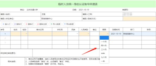 请仔细填写列表相关信息,明细表中账号为网络信息工作人员编写,申请人无需填写。点击“期限”选择需要使用的时间,“到期时间”根据你选择的“期限”会自动变化,无需再填写。