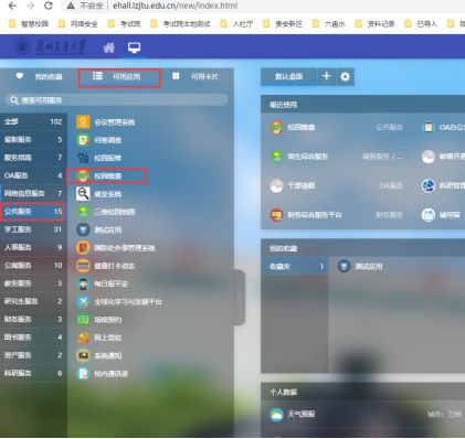 1、 PC端缴费:登录“网上办事大厅”—>”查找”—>”校园缴费” ,进入“缴费系统”。