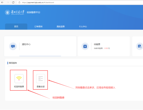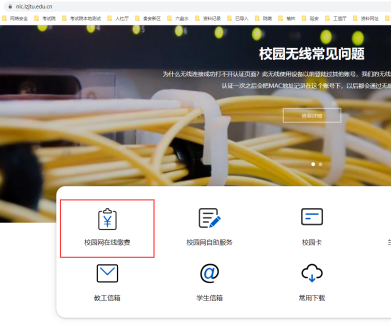 1.PC端进入系统后,在“推荐服务”栏,可以看到最新的缴费业务。点击“校园网缴费”,进入“校园网缴费”项目: