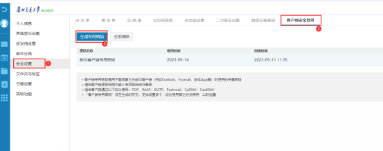 学校教工邮箱开启二次认证后,通过网页登录时需要输入邮箱网页登录密码,并完成二次认证,而通过邮件客户端访问邮件时需要用到邮箱的客户端安全登录专用密码。